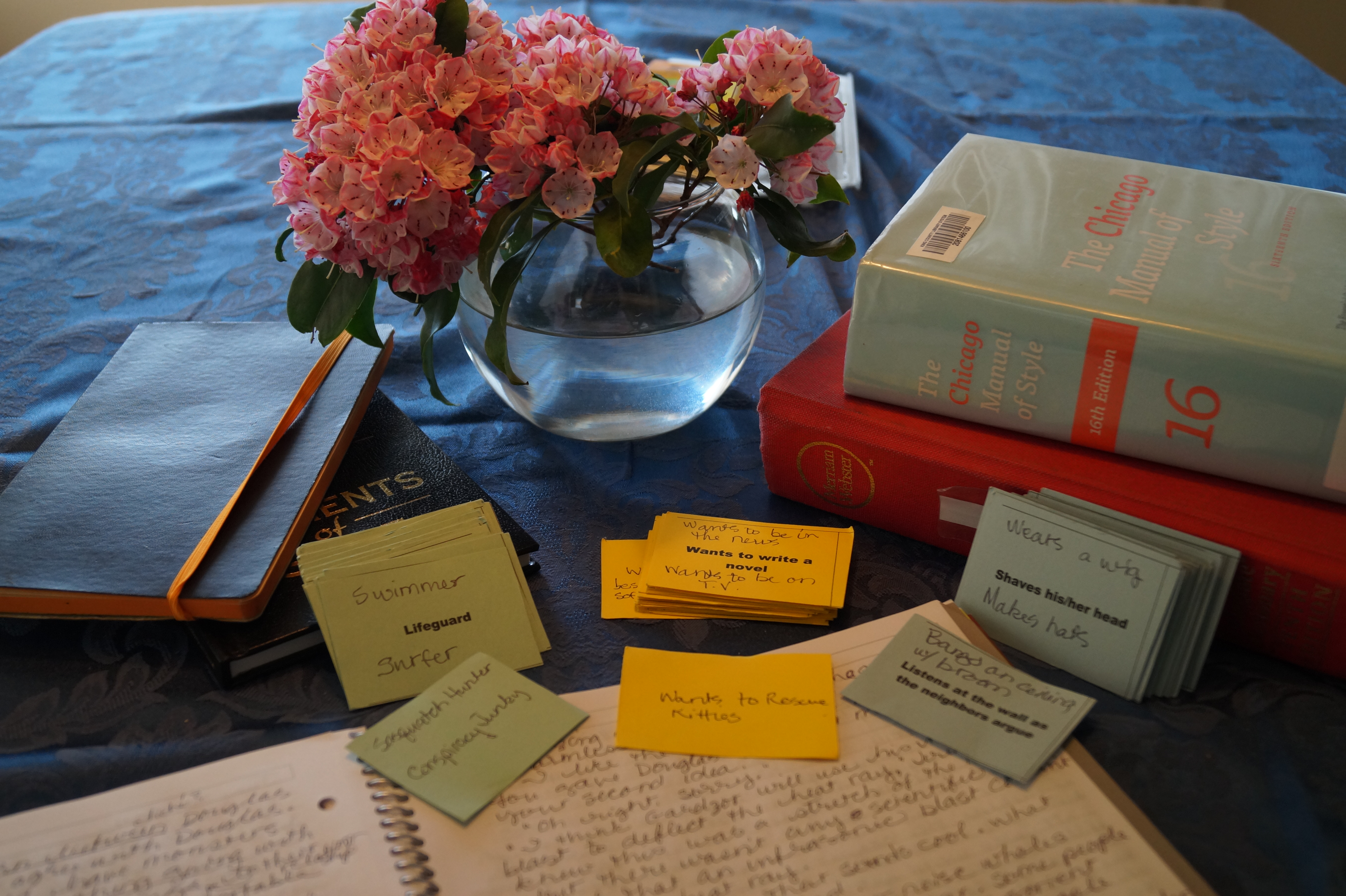 1. Plot-o-Matic – I loved reading Dufresne’s book, Is Life Like This?: A Guide to Writing Your First Novel in Six Months and I will bring it up more when I work through my rewrite. A plot-o-matic is easy to make. I made a Word document with large print, bold type, centered in 3” X 2” rectangles. I printed the subjects – Dufresne used occupations and I added character descriptions like “Conspiracy Junky” and “Disco Dancer”- on green cardstock, the needs or wants of those subjects on yellow cardstock, and an action the character took on blue cardstock. I cut out the different colored “cards” and turned them upside down so I couldn’t see what my options were and chose one of each. If you take a look at the picture at the top of this post you’ll see I drew “A conspiracy junky wants to rescue kittens, so he listens at the wall as the neighbors argue” Fun right? Why rescue kittens? What conspiracy could the neighbors be part of? Are they the neighbors’ kittens? This tool can be great for story ideas, but you can also customize it to help you decide what your characters will do next. Limit the subject pile to only include your characters and choose wants and actions until you feel inspired. Remember to write at least five minutes for every combination you choose. Exploring what you don’t think will happen can be even more exciting than what you thought you were looking for.
