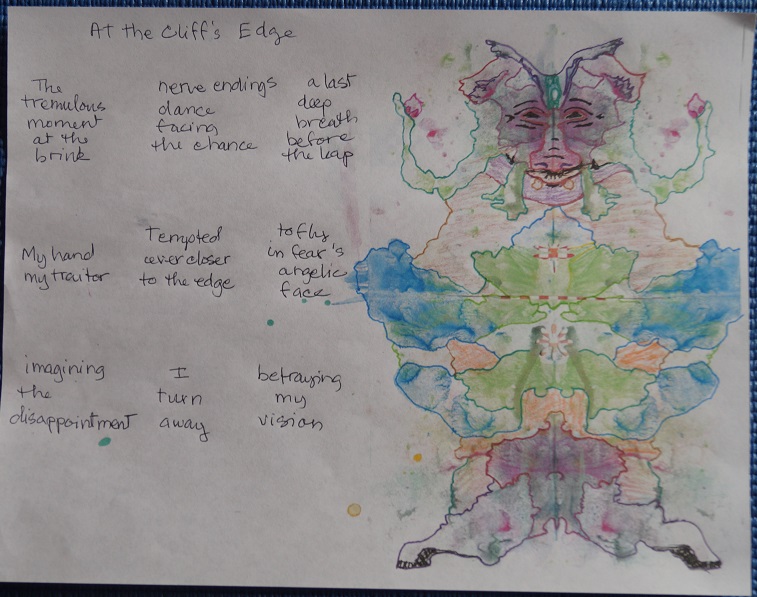 Ever since I started playing with klecksography, I intended to draw on my inkblots and put poems on them, but I couldn’t get myself to do it. I even made photocopies of a lot of my inkblots, but still couldn’t get myself to draw on them. So to go along with today’s theme, I grabbed one of my inkblots, drew this happy creature on it and wrote my poem on it. I dared to try a poem form I’ve been wanting to try as well: a grid in which the poem can be read in rows, columns, and/or diagonally.