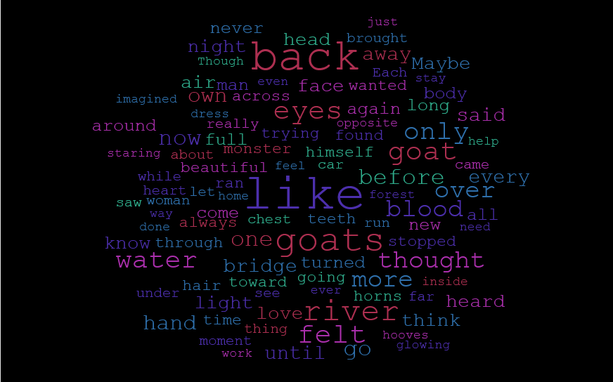 The program has some great tools. After pasting the text into the text box, I clicked on Settings at the bottom right and added the character names at the end of the filter words. Then, once I created my word cloud, I clicked on Wordlist and can click on any of the words to see how many times I used them. I definitely want to look at the instances of “like” and “back” and explore why I used them so much.