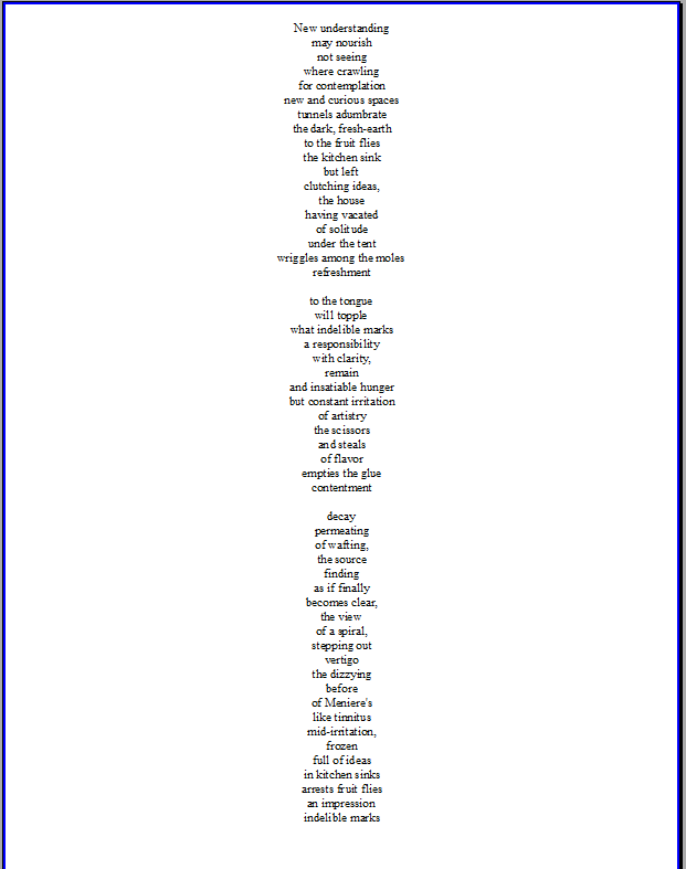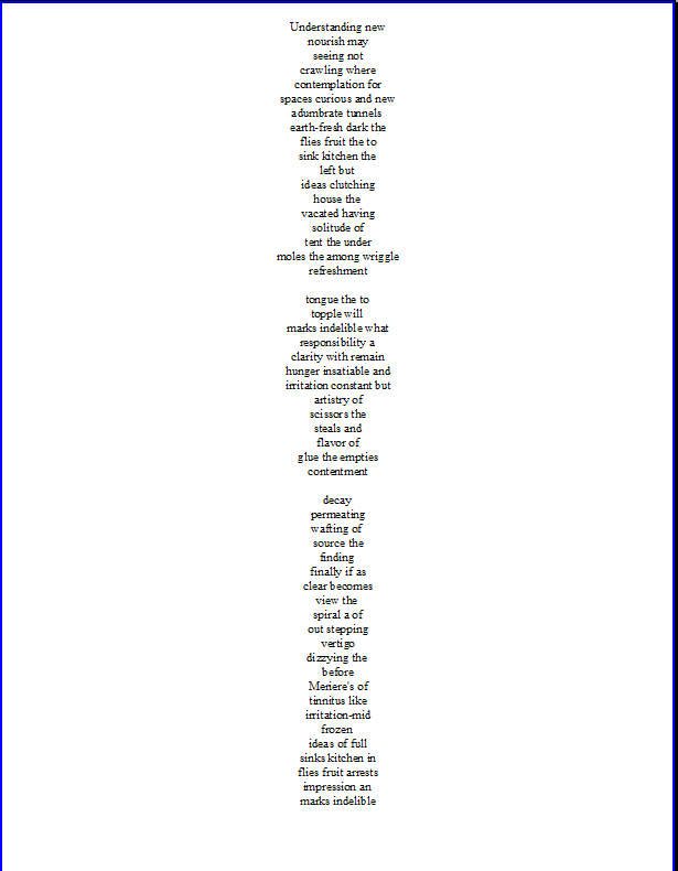 Here’s what I came up with using the first stanza of the original short-centered line poem “Indelible Marks” for demonstration: