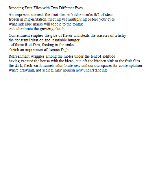 After looking at all my redrafts, I made a few more changes to my poem and was about to upload it to Scribophile, when I saw that in this version the poem read in couplets. Here is the version I uploaded to Scribophile for critique: