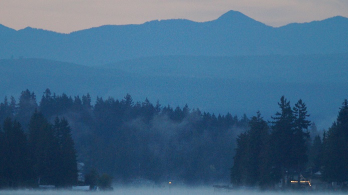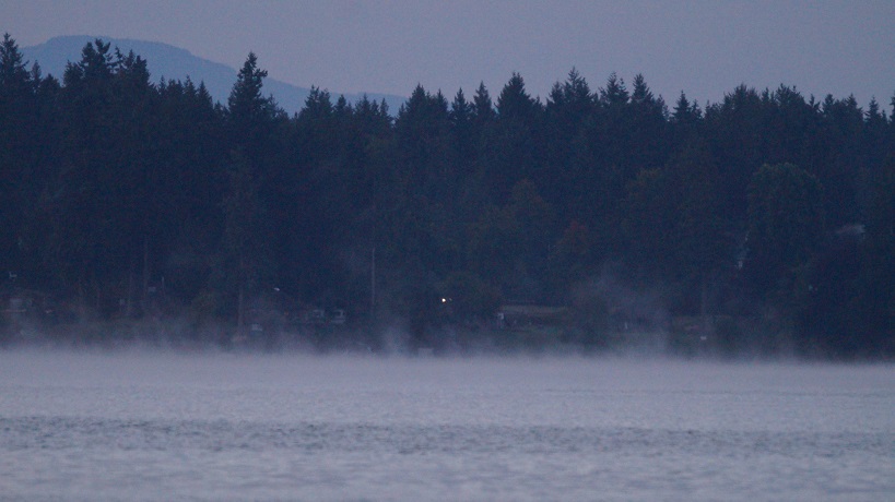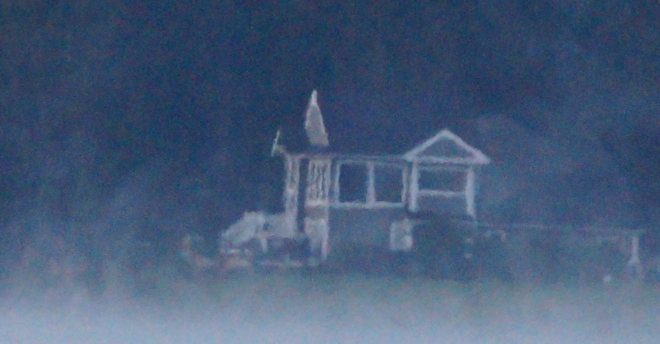 For Tourmaline .’s Halloween Challenge “fog,” I jumped out of bed and was rewarded with a little morning fog on the lake. I love the pareidolia of a giant ghost bat in the trees over that mysterious light in the water.