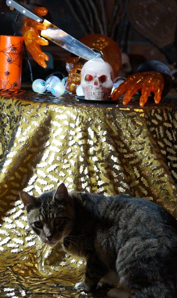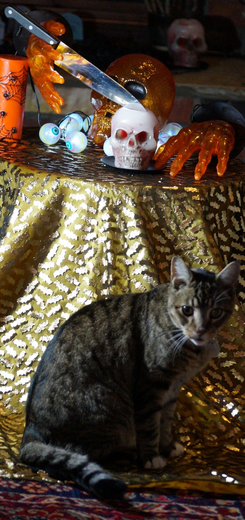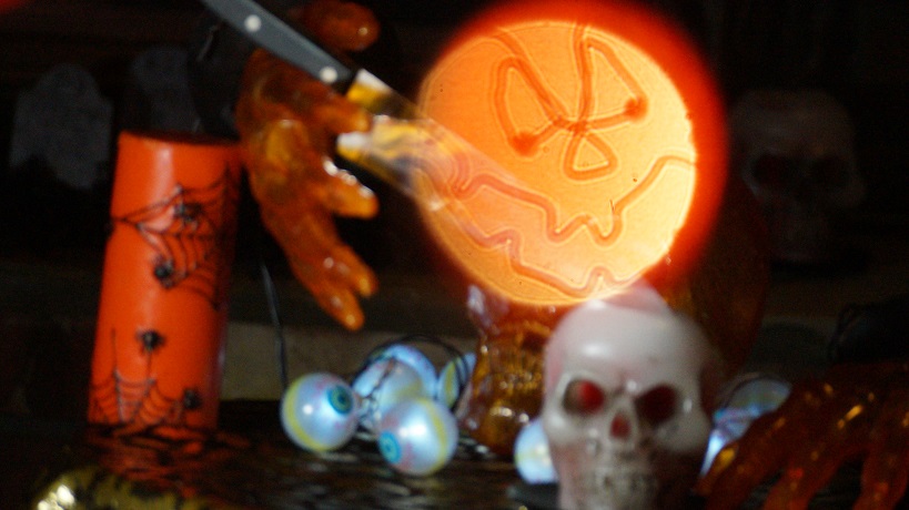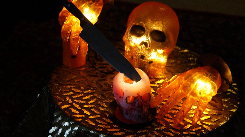 For Tourmaline .’s Halloween Challenge, carve, I went to grab a carving knife from the knife block, but it was missing. Mr. Skeleton had gotten to it first and had gone on a skeleton candle murder spree.