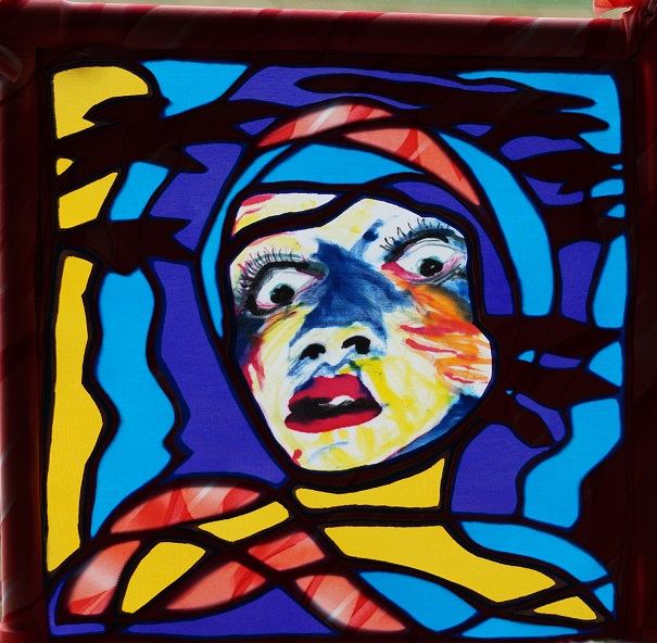 Today’s prompt, “Paris,” made me think of cathedrals and stained glass rose windows. Which made me think of one of my fabric glass pieces. A long time ago, I was inspired by the cover on the box of The Old Dark House (1932). I used fabric dyes to paint the face on treated spandex and created a series. My bather in her vintage swim-cap always looks so spooked. She’s still one of my favorite creations. I’m actually wearing a long-sleeved T-shirt with her on it right now. However, she also looks spooky as Medusa.