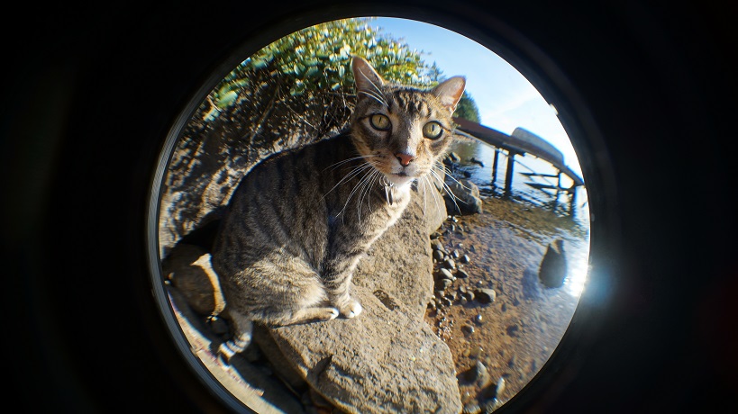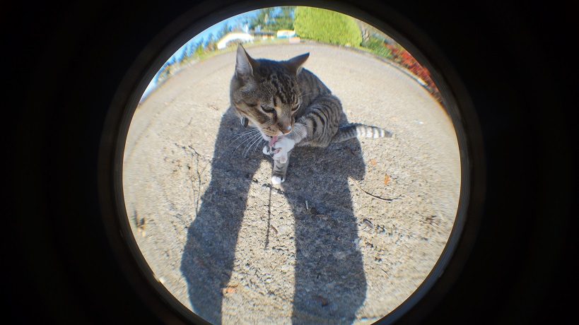 Today I finally have the day to myself and the prompt “Off “should fit well with my mirror world–images reflecting off so many surfaces, and the tilt of the mirror making everything a little off–but the sun came out, so those plans are off. I decided to go see what was popping off outside. A fish-eye lens really helps one see things that are a little off. Kitty is a very uncooperative model, but since he follows me around, he got in the pictures. π