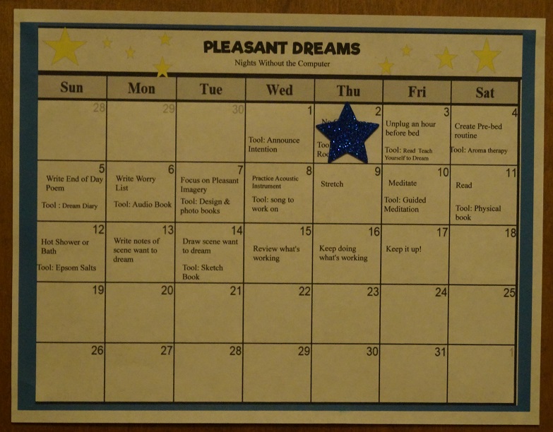 December’s theme is Rest, Sleep, and Hibernation. I didn’t get much done yesterday. I have a terrible cold and feel sorry for myself, but this challenge inspired me to clean my room to make it more relaxing for sleep. I also made a “Pleasant Dreams” calendar to mark the days that I don’t sleep with the computer, and I am happy to say, I put my first star on it this morning. It was a really tough night since I can’t breath through my nose, but kitty woke me up, wanting out, just as my dream was turning into a nightmare, so I can happily report, I did not have any nightmares.