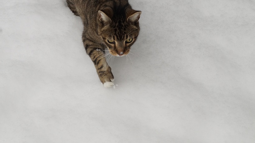 Today’s photo prompt “mittens” inspired me to get wrapped up in my snow clothes and go play in the snow. Kitty came out to guide me home.