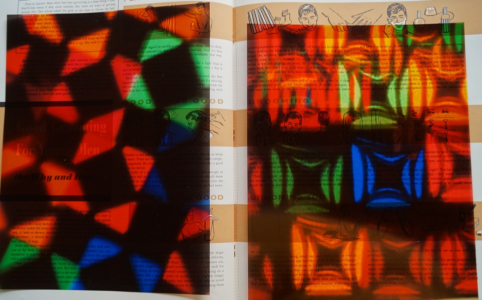 Continuing my idea of quilting, or knitting with light, I thought I would print some of my grid-images onto transparencies, and see if I could make some fun blackout poems with my found, re-treasured magazines.