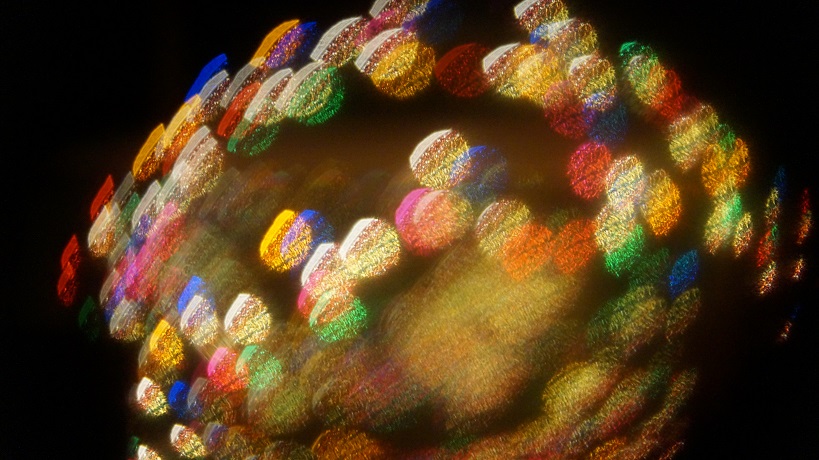 Though I’m just beginning to read the book and think about centric and eccentric composition, I was inspired to try something new in the mirrorworld to change my compositions. In December of 2021, I tried making “wreaths of light” by wrapping lights around a metal ring. Today, I wrapped the metal ring in lights and put it in the mirrorworld. I tied it to a bar overhead so it would stand up. I’ve always draped the string-lights between the mirrors, so this changes many aspects of the compositions. The most interesting change is that the wires between the lights are no longer part of the composition.