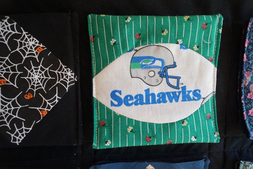 Yesterday, I designed and made a new football-shaped quilt square for my quilt pocket calendar with Seahawks fabric left over from shorts I made in High School. The idea of my pocket quilt calendar is to put little treats in each of the pockets to reward myself for reaching my writing goals each day. The quandary now is what to put in the pockets that I will find rewarding, and what achievements to reward.
