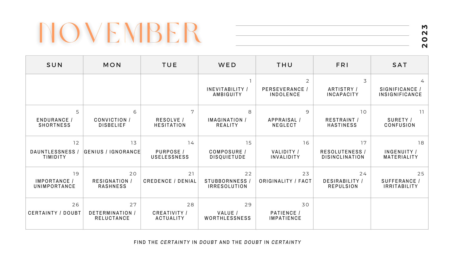 I will be continuing my daily photography practice through November. Each day I will attempt to make an image that shows contradictory abstract nouns in one image. I started this study over a year ago. If you’re interested in learning more about it, you can start by reading my post Contrasting Abstractions. All of the contradictory abstract nouns I chose for November are related to my new Big Five. I discuss how I chose them in my post Continuing My Contradictory Abstract Noun Study. The Big Five I’m studying in November, and using to model my characters’ personal journeys are: