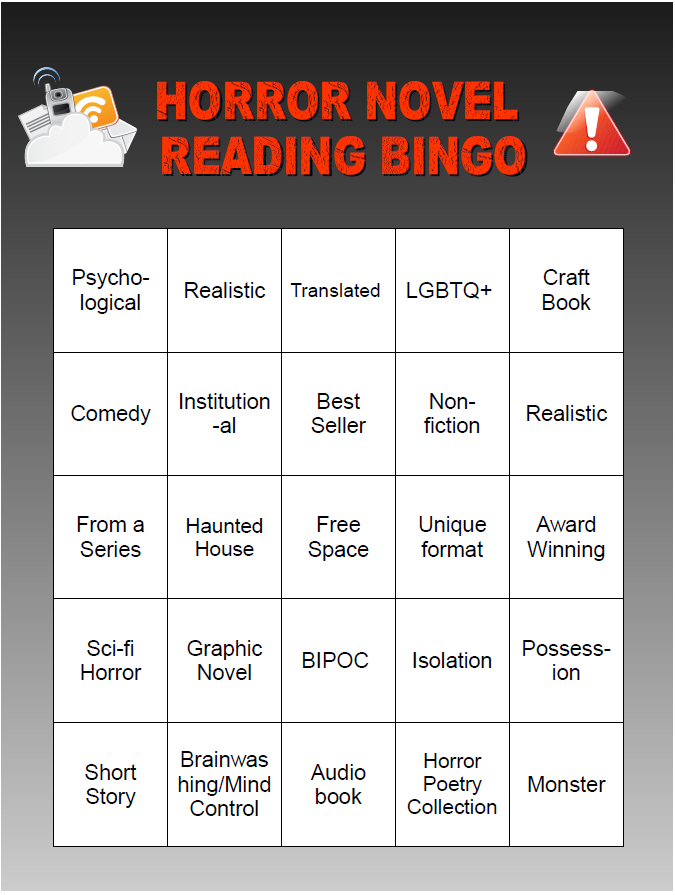 Since I’m exploring writing in a new genre, it’s important I read widely in that genre. Toward that end I made a Horror Novel Reading Bingo card. I still have nine squares left on my Thrill Novel Reading Bingo card to get my blackout. Luckily a couple of those might overlap. Here’s the new Bingo Card: