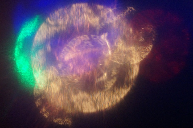 Among the detritus gathering on the floor I grabbed a fistful of the fallen and discarded: cheap costume boa feathers and a plastic disc fallen off of fabric given away because it shed plastic iridescent discs with white glue so old it came out clear I pressed these items together hoping in time they would adhere to a thin plastic lens filter And it took time, stole time, most of a morning, but not wasted time and not my important time, as I used that for other things And when these items of no importance fused and bonded sat upon my lens a universe of beauty exploded and in awe I explored bursting galaxies, dying and birthing stars I captured every one so all could admire this exaltation And this filter, my new favorite, a gift of lint must be carefully preserved locked away untouched, encased and saved for it holds creation's power that takes me to ecstasies