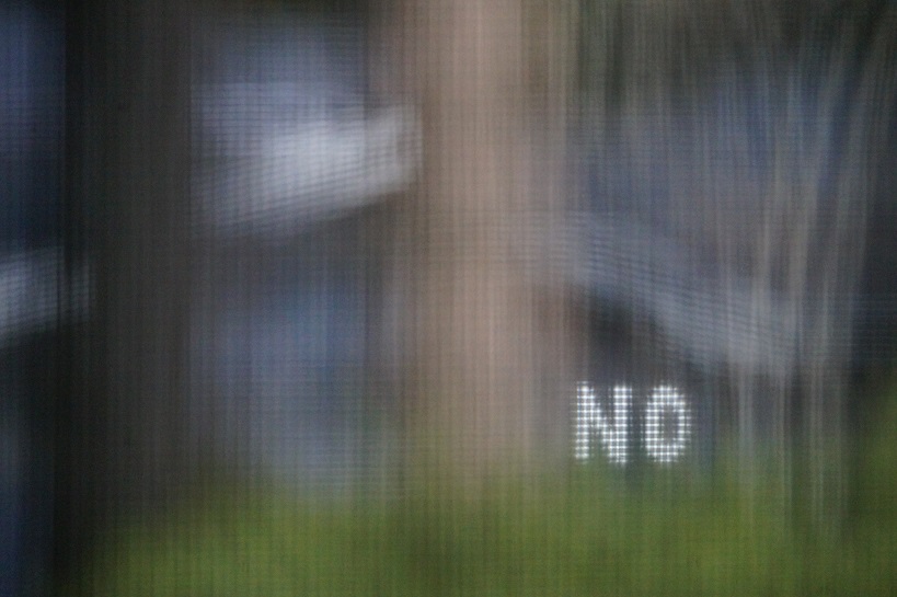 Denial made me think of the word no, of stop signs, a circle with a line through it; things being X-ed out. So I cut all of those filters. Then, for the shoot I did something different. I took pictures of a security light left on all day through my office window. One half of the window had a screen which also added an effect.