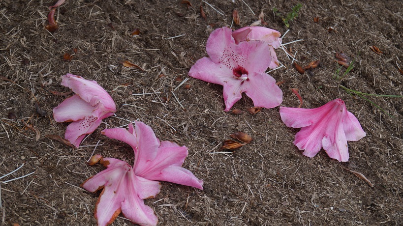 Saturday while I sewed, there was one bolt of lightning, one bowl of thunder, then the sky broke and the rain poured like all the faucets were cranked all the way open, battering and bruising the poor May flowers, so new to this world, tearing them from their clusters and throwing them to the ground ravaged. I walked the yard today, observing the piles of red and pink, tinged brown, already decomposing, and though they have fallen, they are like stars in the heather, constellations detoured to the dirt sky.