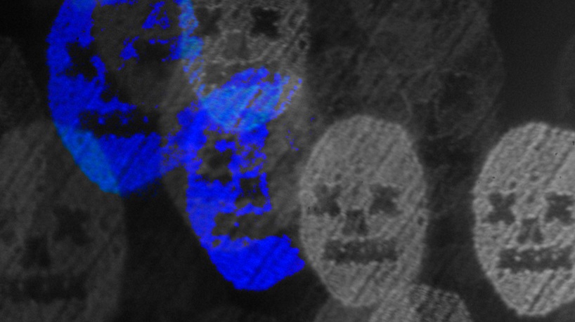 For today’s images, I took an earless headshape cut, over an iridescent plastic filter and drew the Xs for sewn-shut eyes and mouth, and the holes for the lost nose. Then I used the blue-only setting in my camera for the fear. I wondered if the blue only setting would work with the blue depth effect and it does, so that’s a new technique to think about during composition.