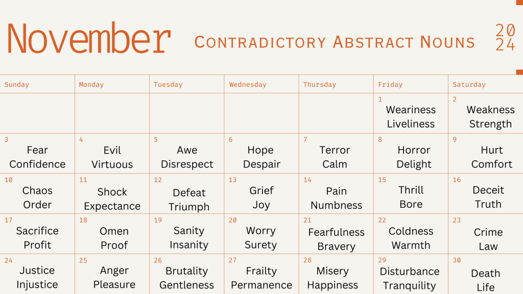 My response to the headlines surprised me, I started scrubbing my kitchen, then cleaned some windows, then did the mending on my sewing table. I cleaned up my sewing crafts area and planned two new sewing projects. Then I suddenly found the contradictory abstract nouns for November (when I just couldn’t the other day). And I reset the calendar quilt for November.