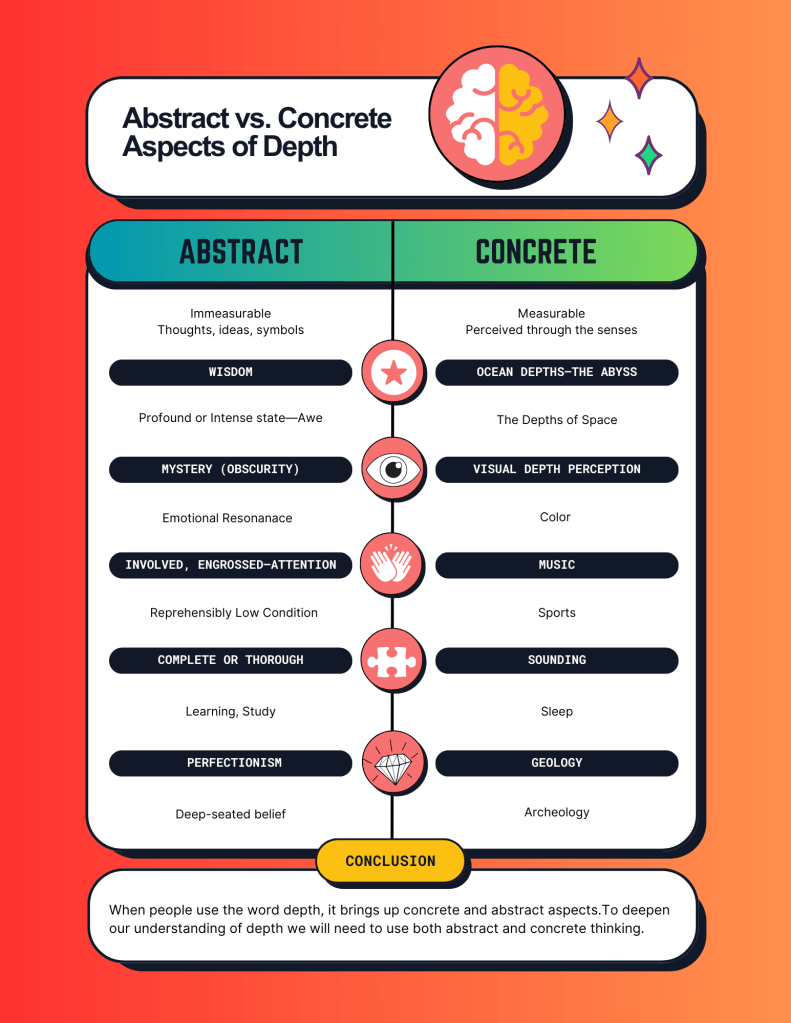 As you can see, depth has many meanings. Some of its meanings are concrete and some are abstract.