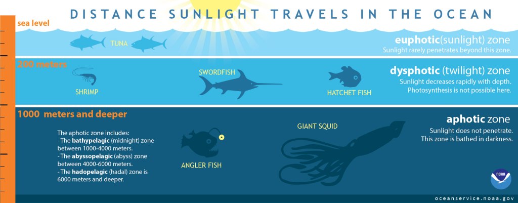 “In clear ocean water, visible light decreases approximately 10-fold for every 75 m that you descend. This means that at 75 m the light is 10% as bright as it was at the surface; and at just twice that depth, 150 m, it is another 10-fold dimmer, or 1% of surface light.” ~NOAA