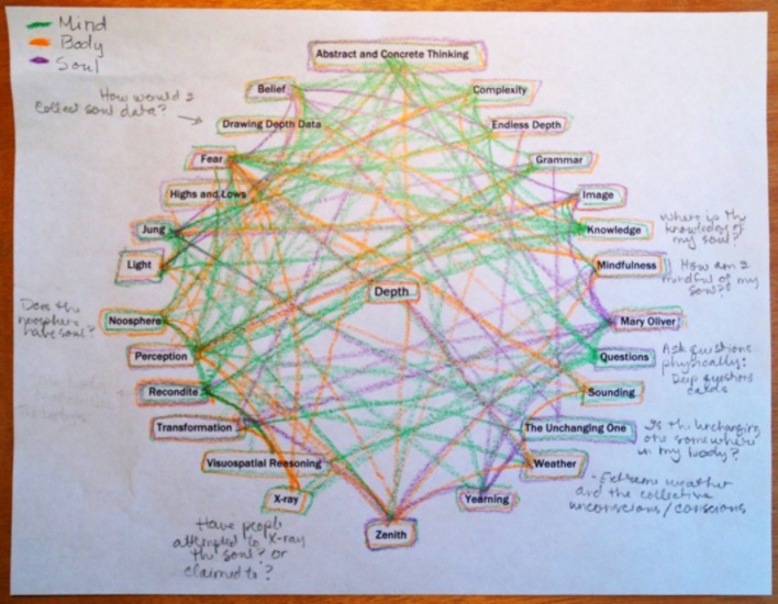 This morning as I reviewed and reflected I was reminded of an exercise I did for novel revision called a character web. I thought it would be fun to create a web of connection for my A to Z posts. Using the Mind, Body, and Soul categories I created in my Zenith post as color coding, I examined how I think the different aspects of depth I discussed from A to Z connect.