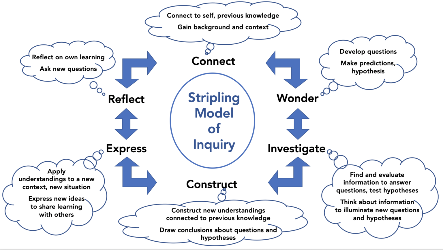 In her article Teaching Deep Reading Skills During Inquiry, Barbara Stripling presents The Stripling Model of Inquiry: